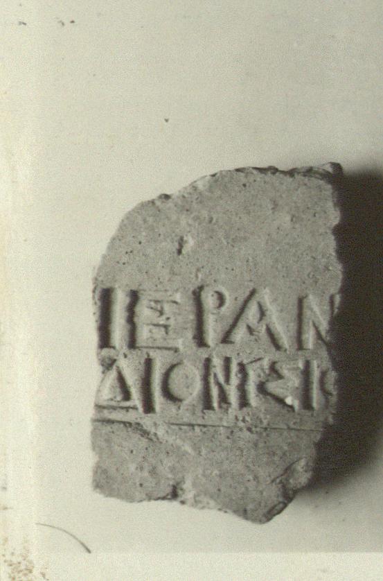 | Description: | Broken all around; back preserved. Coarse dark buff clay with bits; lighter buff slip. Two lines stamp. Cf. series of stamped tiles: A 136 ff., also SS 4. Metroon series. | |