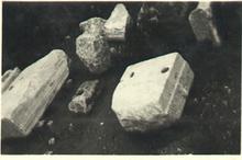 | Description: | Bottom step block. Both ends broken. Front surface worked smooth to 0.120m. from top. The remaining surface below projects 0.01m. from this finished face and is rough-picked. Top surface badly weathered and apparently reused for a threshold: cutting for pivot socket. Dividing line visible 0.016.-0.018m. from front surface. Pry hole 0.045m. back from surface in association with a 0.05m. x 0.015m. dowel cutting. Mason's mark: Ο Δ. Assigned to the Temple of Ares. Pentelic marble. <graphic> | |