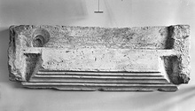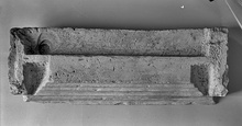 | Description: | A lintel for a single-leafed door, 0.80m. wide. The overhang has two rectilinear and two concave moldings. Triangular cuttings at each end for inserting tenons of door jambs. The cutting for the door is 0.04m. deeper than the under face of the overhang; pivot hole at one end. Pentelic marble. Built into south door of narthex. | |