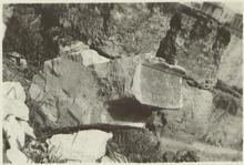 Description:   Full height preserved, one end and back broken away; anathyrosis on preserved end. Evidence of clamp-cuttings on top. 0.350m. back from the front horizontal cornice, the top is finished at an angle to receive the raking cornice.