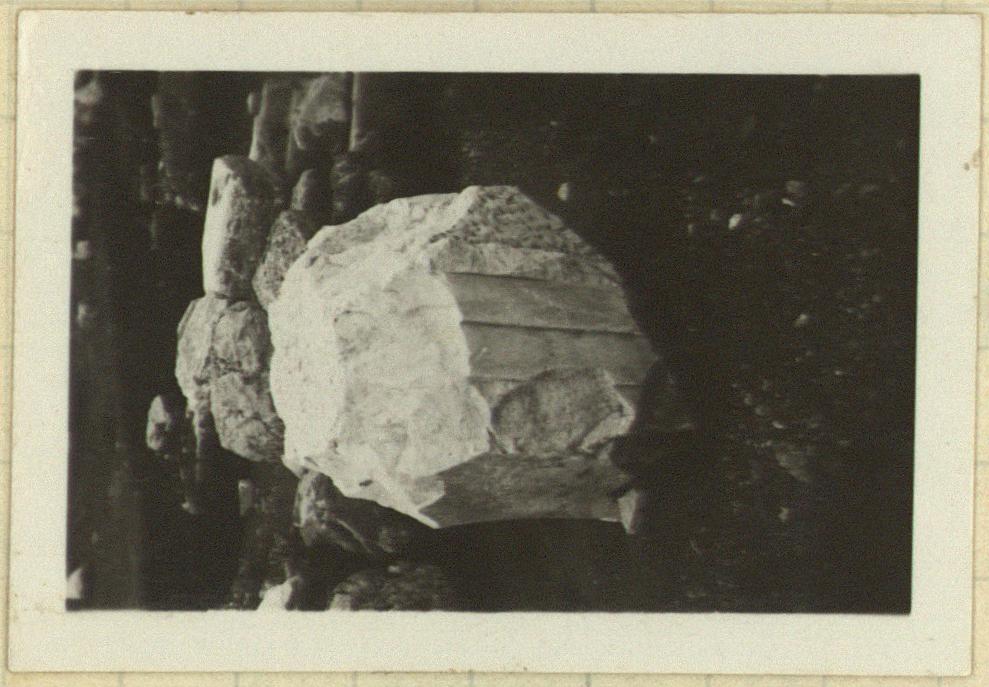 | Description: | Full length preserved, with anathyrosis on both ends. Moldings above fasciae on both interior and exterior surfaces broken away. Vertical surface above fasciae smooth picked on exterior and rough-picked on interior. Exact height of block cannot be determined, for apparently two shallow cuttings existed across the top, one slightly deeper than the other. Lewis holes visible, but top broken away. From the Hellenistic Metroon. Pentelic marble. <graphic> | |