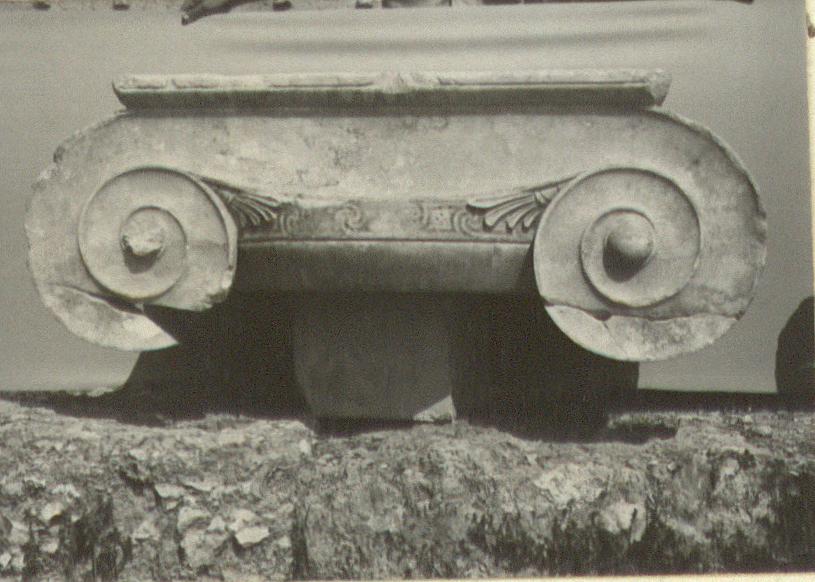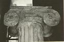 Ornament painted except for palmettes which are carved. Volutes and cushion outlined by narrow bands in blue. Eyes red with a circle of different color at middle (ground of circle now dark).