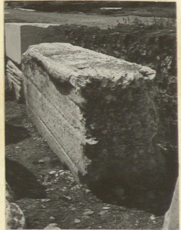 | Description: | Broken at left end, roughly cut back at right end. Heavily weathered in front. In top, pry holes for triglyphs and metopes and near the right end a Π-clamp leading back. Back finished with anathyrosis at lower edge. Fair work. Pentelic marble. With triglyph A 2977 (?). | |