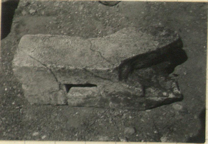 | Description: | Broken at top and along one side. Full width preserved at back. Front has shallow groove tapering toward bottom. Sides have slot for fence rails. Dowel hole in bottom outside edge for doweling to sill. Hard gray poros rough-picked on all faces. Series of A 38. | |
