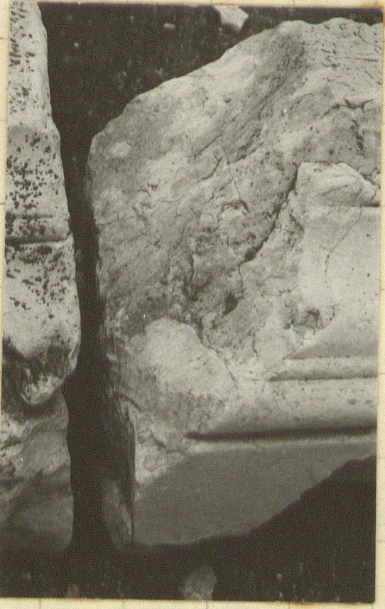 Description:   Three joining fragments only, the left of which preserves the full molding face. Upper left corner of this piece broken away. Like A 3732 but from straight course. On upper surface are three dowel cuttings without pour channels, two lewis holes (left one later cut into dowel) and cutting for Π-clamp on right end. Anathyrosis on both ends.