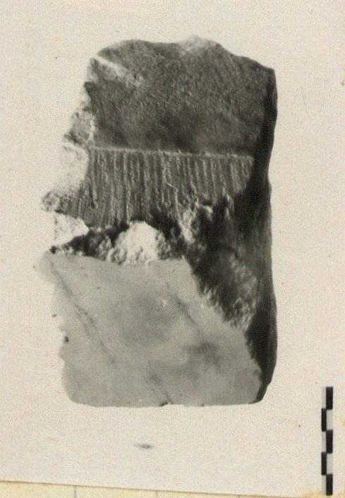 | Description: | Preserved is face and top of block. Face polished but tooth chisel marks still visible. Top 0.015m. has line of molding now broken away. Top surface has tooth chiseled relieving surface with smoother resting surface behind. Not similar to A 3908 and A 3909. From Parthenon. Gray-blue veined Pentelic marble. | |