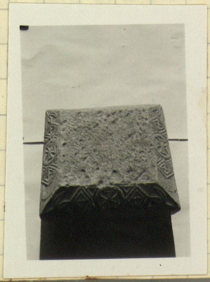 | Description: | A square impost block, carved on the beveled edge with trefoil ornament in the corners, cross with circles in the center, with two crosses in diamonds with dotted triangles as filling ornaments on either side, except one. Rough-picked beneath; smooth-picked on top, with a dowel on one side, to which the design is adapted as a series of diminishing triangles. Byzantine. Marble. | |