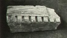 | Description: | Doric cornice block, no full dimensions preserved, re-cut as Ionic cornice. Slightly more than a third of one mutule preserved, with five guttae. Double fascia on face; soffit above broken away. No certain full dimensions or finished edges preserved. Full height only of Ionic block preserved. Parts of nine dentils preserved on face, upper part broken away. Top rough-picked with swallowtail Π-clamp at one end. A similar clamp cutting runs toward the front of the block, suggesting a repair in antiquity, similar to that for A 4503 (ΡΡ' 375). From street stoa? Pentelic marble. | |