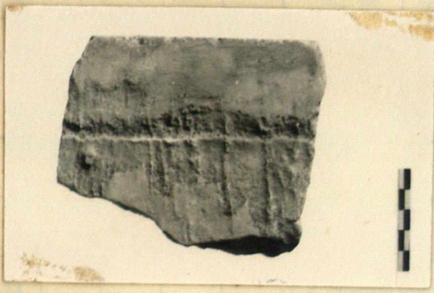 | Description: | Roof tile fragment from back of tile showing upper tile overlap of 0.049-0.05m. by strong weathering line. Cement adhering. Pentelic marble. | |