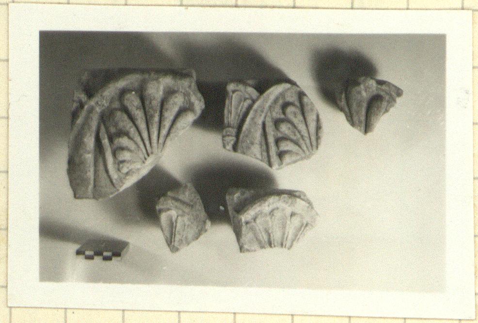 | Description: | Fragments of marble sima of so-called "Megarian" type: reversed palmette and lotus in relief. The entire height, (a) 0.144m., of the upper convex section is preserved, of the lower flat fascia, only 0.103m. The full thickness is not preserved. The top and bottom surfaces and the top were considerably worn before the burning of which there are traces. Made up as crowning members of the Odeion stage front. Pentelic marble. (Since photographing, two more small fragments have been added, and the fragment a) has been joined to the piece shown in the picture at the lower right.) | |