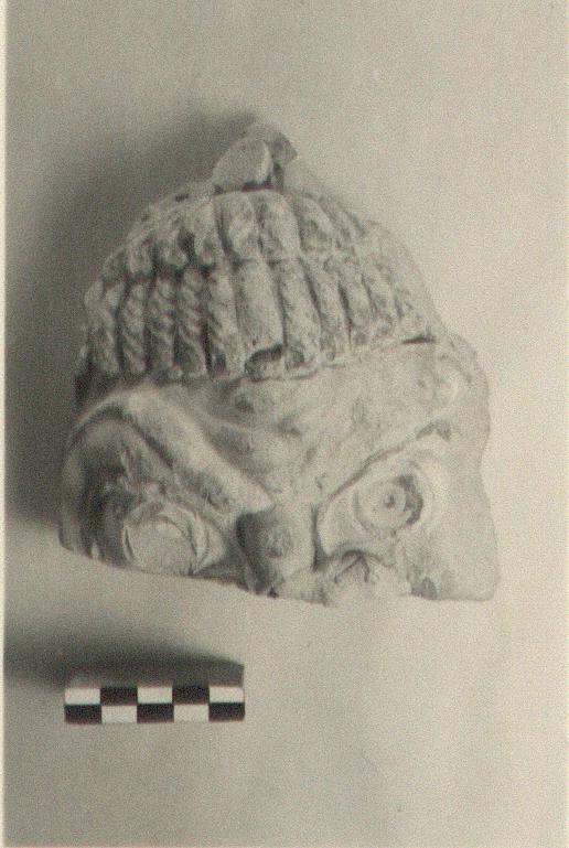 | Description: | Broken away above (slightly) and below. An antefix (?) in the form of a human mask, broken away below the eyes, with two long rows of curls across the forehead; eyes and eyebrows exaggeratedly large. Rather clean pinkish to buff clay. Buff slip, red glaze for hair and details. | |