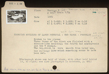 | Notes: | Photograph on card shows one half of block, with other half behind it, to right; see also photograph in notebook, p. 431. Found at I/14-10/19 (Fall 2016). | |