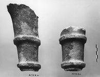 | Description: | A tapering round tube surrounded by two raised rings and set raking. a) Probably preserved to full length of tube; broken away below. b) Broken away at inner end. c) Broken away at inner end. These spouts had nothing to do with A 1131, but they may possibly be associated with the sima A 758 (Η 650). Parian marble. Fragment b) later restored as part of A 758; also same as A 1987 and A 2992. Cf. raking series A 390 etc. | |