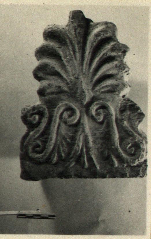 | Description: | Top of palmette antefix missing. Minor fractures. Cover tile completely broken off. Coarse red clay with bits; coating of white on surface. | |