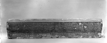 | Description: | From a raking cornice; the full width preserved at the front, and the full height of the sima; much of the tile remains behind, with part of the right edge, but not the full depth. Broad red band on soffit. On face, palmette and lotus band between maeander and bead and reel, decoration light against dark red ground. Coarse pink clay; pink to buff slip. On the top of the tile, large letters of red glaze carefully painted: [Ι Ε Ρ Α ΑΙ Σ Τ] <graphic> | |