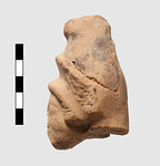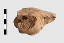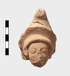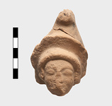 | Description: | Head of archaic terracotta figurine. Badly worn. Hair had 3 rows of curls. High stephane behind which pointed cap. Reddish clay. | |