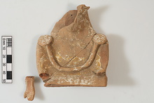 | Inventory Number: | | AF 507 | | Title: | | Figurine Fragment | | Category: | | Terracotta | | Description: | | Upper part of seated terracotta figurine. Flat, pointed oval head, half broken off. Rayed crown. Necklace with shoulder brooches. Right hand preserved. White slip; ear painted in red. Crown, earring, and chiton bright yellow. | | Notes: | | Munsell (fabric) 2.5 YR 6/6 light red; (slip) 8/N white; (paint) 10 R 4/6 red and 10 YR 6/8 brownish yellow | | Conservation Status: | | Finished | | Context: | | Charles Morgan/B. Gorbe, Nb. No. 17. | | Notebook Page: | | 61 | | Dimensions: | | P.H. 0.113; P.W. 0.087; Th. 0.03 | | Date: | | 28 February 1934 | | Bibliography: | | Hesperia 4 (1935), p.202. | | References: | | Publication: Hesperia 4 (1935)