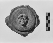 Description:   Fragment of plaque with shield decorated with color and in center a gorgoneion.