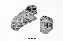 Two nonjoining sections: one wall fragment (b: P 3229 b) and part of wall and rim (a: P 3229 a+ P 20593).
