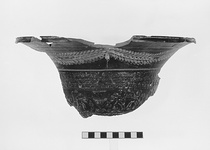 Over half of rim and one-third of lower body (a), plus two large, nonjoining rim fragments (b, c, not illustrated), with fragment b preserving trace of handle. Made in fairly worn mold.