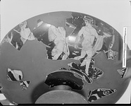 I, komos. A youthful komast (part of legs, hands missing) dances to right, preceded by another (neck, upper part of body, feet), who walks to right. Each has a fillet around his head; a cloak over the raised left arm of left, over left shoulder of right. Reserved exergue. Around tondo, stopped-maeander pattern with cross-squares. A--B, komos. On one side: part of drapery, legs, hands of one komast; upper parts of the second with a fillet around his head, his right arm outstretched, a staff in his left hand and a cloak over his left shoulder; all of the third, except for head and feet, who plays the aulos. All three move to right, as well as the fourth, who looks back, a fillet around his head. He holds a staff in his right hand, a phiale in his outstretched left, and he has a cloak over his left forearm. On the other side: feet, raised hand, a little drapery of left komast; all of next except for part of his right leg, who plays the aulos, both to right. The latter has a cloak over his left shoulder. Then comes one who is frontal, head to right, a cloak over both outstretched arms. The last komast (left foot missing) dances to right, a cloak also over his left shoulder. Fillet around the head of each. At each handle encircled palmette-and-tendril configuration (part of each). Below the figures, three reserved lines. Preliminary sketch.