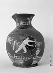 Mended with missing pieces restored in plaster and painted, notably much of the body. Glaze abraded in places. Rest. H. at handle 0.24; diam. 0.19. P. E. Corbett, Hesperia 18, 1949, pl. 84:16; Choes and Anthesteria, p. 85, cat. no. 197, fig. 118.