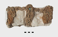 | Description: | Large fragment preserving the end of a trident. No shaft preserved. Badly corroded. Now attached to plaster. | |