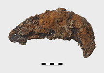 | Description: | Complete. Badly corroded. Large scythe/sickle or pruning hook, with a small hole close to one edge. | |