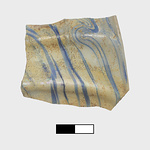 | Description: | Single fragment preserving part of rim and body, probably of a bowl. Broken all around. Surface flaking on interior. Iridescence. Opaque glass yellow with irregular blue veins. | |