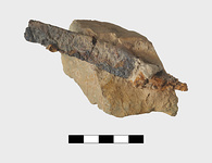 | Description: | Single fragment of a knife, mended from two pieces, fastened to a stone. Corroded and rusted. Thin, flat blade tapering to a point. | |