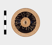 | Description: | Kylix base with black glaze. Portion of stem preserved. Inscribed on bottom. | |