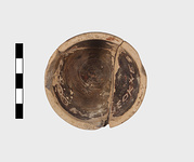 Description:   Bowl of soft clay with brown slip which flakes off easily. Inscribed on inside. Found in three pieces.