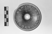 | Description: | Kylix base with black glaze. Chipped slightly on edge. Inscribed on bottom. | |
