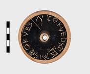 Description:   Kylix base with black glaze. Some red lines on top. Inscribed on bottom.
