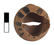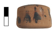 | Description: | Small jar of yellow clay found in pieces. Top broken off. Decorated in black. | |