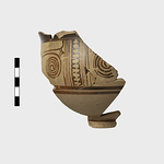 | Description: | Broken in two pieces. Bands, parallel lines, scallops and spirals in brown on buff. ADDENDA 2017: 1 joining rim body sherd (mended from two pieces). From Lot 478, Layer VI A (Depth 7-9.30m). 2 non-joining body sherds (fragments b and c), Layer II (Depth 3-5m). ADDENDA 2018: Eight sherds mended into three sections to a large deep bowl with a flaring rim and low ring base. The exterior decoration includes a medium rim band, two narrow bands running below the handle zone, and two narrow bands placed at the junction of the bowl and the ring base. In the handle zone, the decoration is panelled with a central triglyph with inverted joining semi-circle fill flanked by antithetic spirals with a chevron fill. The interior is monochrome with a narrow reserved band at the lip. The paint is thick and uniformly applied. The firing is uneven, ranging from light to dark brown. There are no clear traces of use-wear or burning as preserved. Furumark Shape: 285; Furumark Motif 1: 75; Furumark Motif 2: 42; Furumark Motif 3: 50; Furumark Motif 4: 58 | |