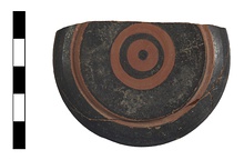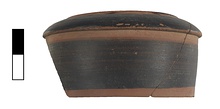 | Description: | Part of base and part of rim preserved. Unglazed inside. Black outside with narrow bands of red. Straight sides. | |