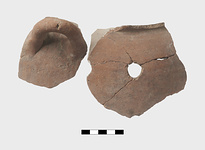 | Description: | Fragments of red clay brazier with one handle and two holes preserved. | |