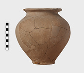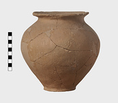 | Description: | Tan pocked clay; fragments mended; part restored. | |