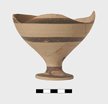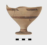 | Description: | Mycenaean stirrup vase. Incomplete. Two concentric rings in reddish brown glaze to black. The foot and half of the stem is completely glazed. Buff clay. ADDENDA 2018: Ten sherds mended into a single large fragment of a stirrup jar with flat domed base and short stem. The exterior decoration consists of at least three medium bands on the body of the vessel and a monochrome foot with reserved edge. The paint is thick and evenly applied, unevenly fired, red to dark brown. There are no traces of use-wear or burning. Furumark Shape: 182 | |