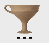 | Description: | Mycenaean fragmentary kylix. No decoratioon. Buff clay. ADDENDA 2018: Two joining fragments preserving the near-complete profile of a carinated kylix with deep bowl, a short flaring rim, short stem with domed foot, and single vertical-handle with rectangular profile. The entire vessel is undecorated beyond a thin pale wash or slip. On the interior of the lip there is a small, roughly circular burn mark, presumably indicating the use of the vessel as a lamp. There are no other traces of use-wear preserved. Furumark Shape: 267 | |