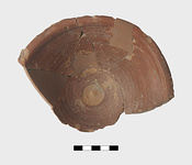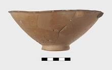 | Description: | Mycenaean two-handled bowl, about one-third preserved. Slip fired red on interior, no decoration. Buff clay. ADDENDA 2018: Seven sherds mended into a near-complete profile of a shallow conical bowl with flat rim, one partially preserved, horizontal strap handle, and a raised ring base. The exterior is undecorated as preserved. The flat surface of the rim and the interior are monochrome with a reserved circle at the very bottom of the bowl. The paint is thick and mostly evenly applied, fired dark red. There are no traces of use-wear or burning. Furumark Shape: 295 | |