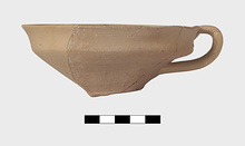 | Description: | Fragmentary small bowl with one vertical handle and offset rim. Coarse clay, buff, unpainted. Sagged in throwing. ADDENDA 2018: Four sherds mended into a single complete profile to a conical cup with carination at mid-body, flaring rim. A single vertical handle, oval-section, is preserved. The base is flat raised. Appears to have a thin slip all over. There are no traces of use-wear or burning. Furumark Shape: 222 | |