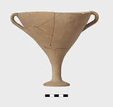 ADDENDA 2018: 21 fragments mended into a near-complete kylix with deep conical bowl with lipless rim, a short stem with domed base, and two vertical handles with rectangular profile. The entire vessel is covered with a thin pale slip, but there is no other decoration.