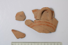 | Description: | Side, rim and handle of a shallow bowl. Orange on buff. ADDENDA 2018: Five sherds mended into the complete profile of a conical incurving bowl with a single horizontal, round-section handle and ring base. The exterior decoration consists of a medium band running below the rim. There are an additional two medium bands running below the handle zone. The handle is decorated with multisplash decoration. The interior is monochrome. The paint is thick, but somewhat unevenly applied, fired orange. There are no traces of use-wear. On the interior there is a small roughly circular patch of burning near the rim, possibly from use as a lamp. Furumark Shape: 242 | |