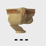| Description: | Rim and handle of shallow bowl of tea cup shape. Orange red on buff ground. ADDENDA 2018: Frag. a: five sherds mended into one large fragment joined to original single piece and three non-joining fragments (frags. b - d). Large semi-globular cup with a flaring rim, vertical, rectangular-section handle and raised base. The exterior decoration consists of a narrow lip band with a medium band running below the rim (and under the handle). The upper part of the handle is painted with a single splash of paint. The lower body and foot are reserved. The interior is monochrome. The paint is thick, with regular streaks, fired red. There are no traces of use-wear or burning. Some sort of residue splattered on interior of vessel. Furumark Shape: 215 | |