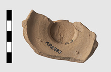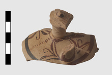 | Description: | Fragment from shoulder of stirrup vase decoration with floral pattern. Dark red glazed paint on yellow buff ground. Joined to AP 2876. | |