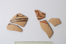 | Description: | Brown on buff. ADDENDA 2018: Five sherds mended into three fragments of a deep bowl. No features are preserved. On the exterior there are two medium bands running below the handle zone. In the handle zone there is an unknown, possibly spiral motif. The interior is monochrome. The paint is thick, evenly applied, but fired unevenly brown to black. There are no traces of use-wear or burning. Furumark Shape: 285 | |