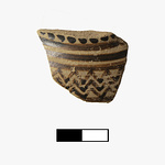| Description: | Brown on buff. ADDENDA 2018: Two non-joining sherds to a small closed shape with no preserved features. [Fragment b added from lot.] The exterior decoration consists of a row of dots at the junction of the neck and body, followed by three horizontal zig-zags framed by three narrow bands above and at least two bands below. [The handle was boxed out by two vertical narrow bands.] The paint is thick and fairly evenly applied, fired dark brown to black. There are no traces of use-wear or burning. Belongs with AP 3036. | |