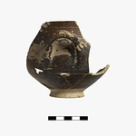 | Description: | Seven sherds mended into a single complete profile and one non-joining fragment to a small deep bowl with flaring rim and horizontal, round-section handle and ring base. The exterior decoration is monochrome with a reserved foot and lower body. The area below the handle is unpainted with the exception of a single stroke of paint -- possibly intended as a potter's mark. The interior is monochrome with the exception of a narrow reserved band on the lip. The paint is thick and evenly applied, fired slightly unevenly brown to dark brown. There are no traces of use-wear or burning preserved. Furumark Shape: 285 | |